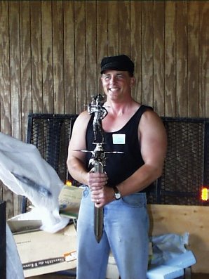 Eternal Struggle is the title of this piece. Ward say's the dimples in the dragon each took three strokes using a three pound hammer! This work is roughed out hot, then carved with chisles and finished with files and abrasives. The dragon is mild steel while the sword and other parts are stainless steel. The dragon is finished by a rust browning method. | |||