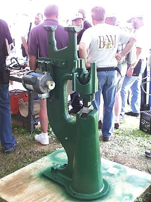 The early model 25# Little Giant power hammer from the power hammer rebuilding workshop. Hammer is to be placed in the Iron in the Hat contest. |