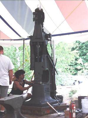 Tony Reece, of Ahtens GA , tightening or adjusting the dies on the Chambersburg 300#, and the back of Bill Price of Memphis, TN, Were part of the power hammer crew that provided support to the demomstrators. The other members of the crew were David Ponsler, Jacksonville FL and Toby Hickman, Sebastapol, CA.