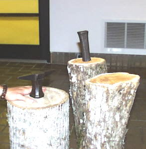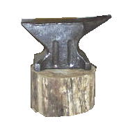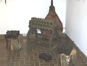 Swage blocks and an old bellows. The long stand mounted block is rather unique and a very intresting design. The small block on the floor appeared to be someone's personal "special" pattern. The other two I've seen before in use or in other collections. |