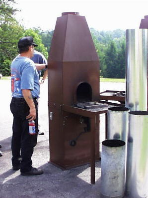 These side draft chiminey forges were all over the site and show up in many of the previous photos. They worked quite well and are a proven design. Note the large 10" (25cm) vent pipe (or is it 12"?). |