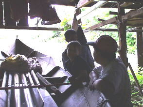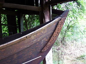 BELOW LEFT: Guests looking over the Gyrfalcon, the Longship Company's "small" boat. This is a reproduction of an actual Viking period boat made with lapstrake construction and copper rivits. BELOW: Closeup of the bow of the Gyrfalcon. Details about the Longship Company's boat and their ship the Fyrdraca can be found on their web site at: http://www.wam.umd.edu/~eowyn/Longship/ |