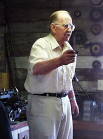 | Harry (Hap) Fisher of Windsor Forge, demonstrated metal spinning. Hap describes himself as an artificer (decorative metal worker). He spins pewter for making reproduction colonial items and also does hammered metal work. Above left, Hap is showing an edge trimming tool made from a piece of hacksaw blade. The lathe in use was an 8" Atlas lathe. Atlas also made the small Craftsman lathes popular in the 50's and 60's. | ||||