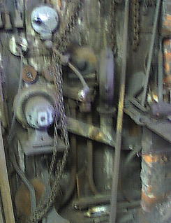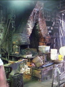 This pre Civil War shop is located in a downtown neighborhood. Originally a livery and farriers shop the Rileys now do small industrial forging. Double blowers feed air to the forge. Electric and manual blowers are connected to the same pipe. The hand crank blower would give that fine control necessary for doing fine work. I didn't have the presence of mind to look for a blower on the right hand side of the forge. Sorry about the bad focus. My Olympus digital camera will take beautiful photographs in low light but the stupid automatic focus won't work in the same light! |