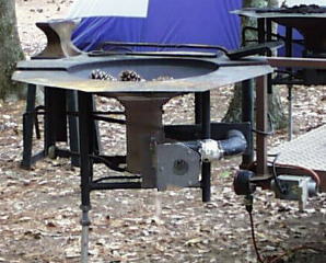 Forge pans were made from the ends of a discarded hot water heater. In the center a "pot" was made about 6-7" in dia and 3" deep. The tywer is made from a big weld "T" with a counter balanced ash dump. The clinker breaker is fabricated from round disks welded to the cross bar. | |||