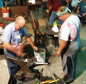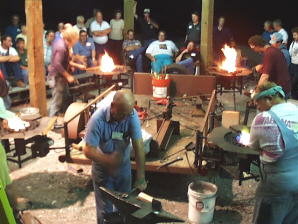Second Heat Doug Merkel in front with Tom Clark as fireman. Left rear is Mark Linn with his son Mike as fireman. Off to the left is Tal Harris with his wife Kim as fireman. After the second heat Big Bob counted the nails and added points for various things and declared a three way tie between Tom Clark, Doug Merkle and Tal Harris. On my suggestion all the contestants used Tom's anvil (and fuel) for the remach to prevent any claims of unfairness. |