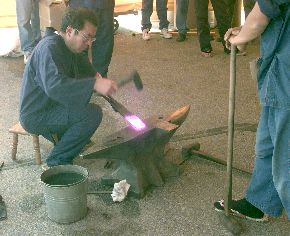 Notice the striker standy by with a very long handled sledge. Traditional Japanese hammers and sledges have the handle set way back in the head. This style of hammer was traditional World wide at one point. It is still used by western crafts people for certain types of work but has generaly been replaced by hammers with the handle nearly centered. |