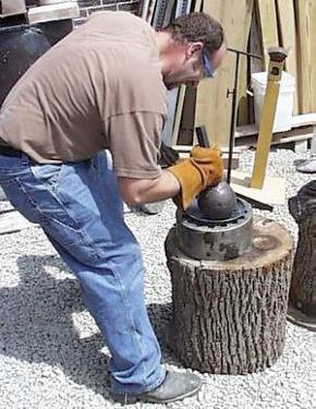 Here he is making a shield boss by hot sinking it into a form using a ball stake "hammer".