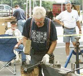 Steve Barringer of B2 Design and Big BLU Power Hammer School looking on. Uri is straightening a piece on a wood stump.