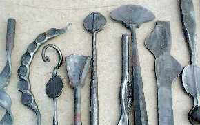 ![]() Forging the depressions for a twistless "twist". Each flat is forged at 90° and then twisted 90° to put them on the same plane. See the fire tool handles below for the result. |
