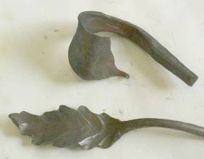 The next element forged (#1) was a ball end and a long taper. That was followed by (#2) an "Oakhill" leaf using the short point and long taper then flaring half off the combo dies to spread the leaf and leave a center ridge. I made two on one bar and made an S-hook out of it. ![]() |