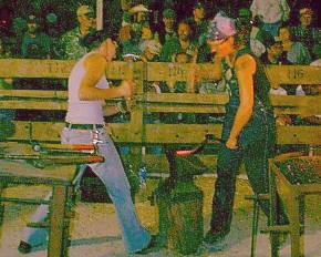 Ted cold forged the 3/8" section on my advice and finished a near perfect ring in record time. Drawing out the larger piece was ALMOST completed in time. . . Other teams included Patrick Nowak another anvilfire regular. The winning team was two fellows that had never met until the contest. They managed to make two fairly round rings about the smae size. A tough contest! |