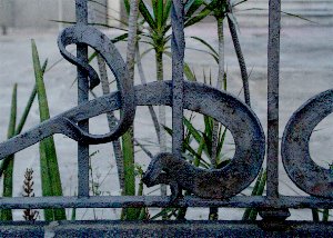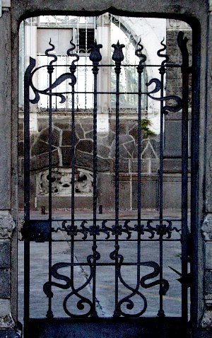 There IS some good ironwork in Costa Rica if you know where to look for it. Luckily we had Johan Cubillos as a tour guide in central San José. These Art Nouveau gates and fence are almost entirely hand forged and inlude a great many forge welds. There are a few cast components such as the molded collars but they are appropriate for the design. It is speculated that a European smith was brought over to do this job or that the work was imported as this is the only example. |