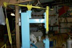 Ram is 32# Crank stroke is 7", stroke of the ram at full speed is about 11" Dies are S-7 combination type. Motor was a found, without nameplate, 220vac 1 ph, and i suspect is in the 3/4 to 1 Hp. range. The photo entitled stroke adjustment is the access to the grease fittings thru the guard. I put grease fittings to feed moly grease to all moving surfaces, and have not seen any wear yet. I am in the process of reworking a bit. I went from a 1" radius on the fullering portion of the dies to a 7/8" radius per Uri Hoffi's design, and have changed to a heavier, tapered truck spring. I am adding about 12# to the ram. FredlyFX, the hammer beats a hand hammer every day. I am tuning now for max. performance. As I am a pretty good scrounger, i have about $43.00 invested in the hammer, and about that much more in the foundation. To all who have or are going to build a JYH, especially one of the crank actuated spring hammers, Please, Please install a guard on the machine top to contain the ram and spring parts if the spring breaks. The ram will exit the machine if the spring breaks on the upstroke! I have seen several JYH's with unguarded belts, cranks and springs. Please don't run this way, as the risks are too high. I will advise as to the effects of the changes. |