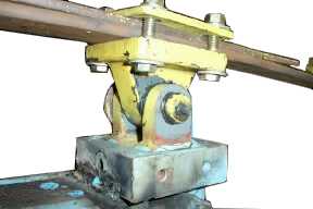 The pitman arm pivot at the spring end. Again cylinder parts, again the pivot is drilled for a locater pin, and the pivot pin is grease fitting and drilled to the wear areas. Right, the ram rollers with grease fittings. | |