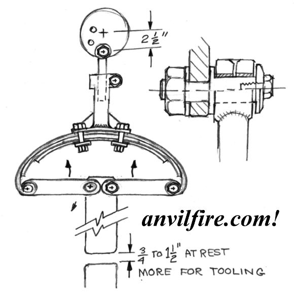 The springs must be preloaded sufficiently to support the ram with the toggles nearly horizontal. Note that due to the infinite leverage at the horizontal position the toggles will always sag 3 to 5 degrees. This requires about 5 to 6 times the ram weight in outward force. The total stroke of a Dupont toggle machine is twice the crank offset, plus the distance between dies and the upward stroke while compressing the spring. In the above that is: Note that the guides must support the ram for this distance PLUS the height adjustment. The height adjustment shown just below the crank is typical of commercial machines but is not always a good option for the hammer builder. Other ways to provide more work space is to use spacer blocks under the lower die. This works well with bolt on dies. Another possibility is to raise and lower the entire crank shaft and clutch mechanism. Stroke adjustment is not common on DIY hammers. However, it should be. On the CR-JYH that this sketch is based on the builder used a milled slot in the crank wheel. While this seems logical a series of holes is simpler and works better. The stroke adjustment is one that you do not make fine movements of. It is either full, minimum OR occasionally in the middle. All this requires is three holes. Using holes the parts are simpler and there is no chance of the adjustment slipping which is common on slotted designs. |